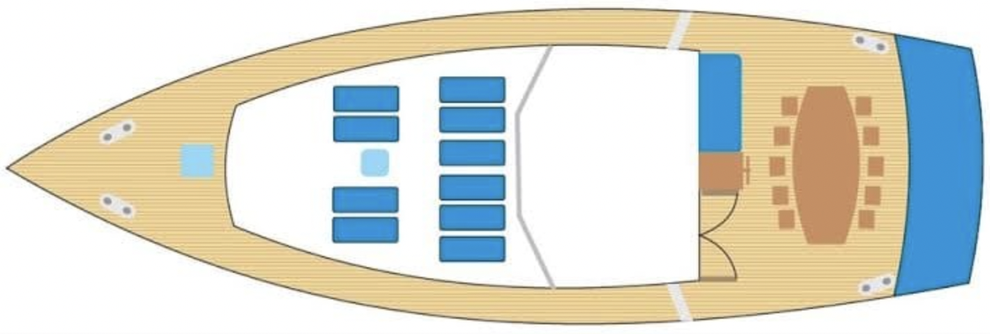 The salon has an exquisite combination of a modern and traditional design. Cabins are unique and different from any other gulet in the Adriatic, with a contemporary look and lovely decorated bathrooms. The front deck has a large area perfect for sunbathing with sun mattresses and a comfortable sofa. While The aft deck has a hard top covered for a shaded dining area with a big cushioned area.