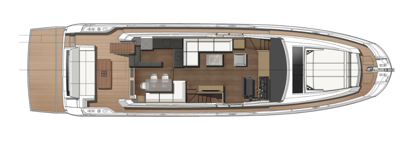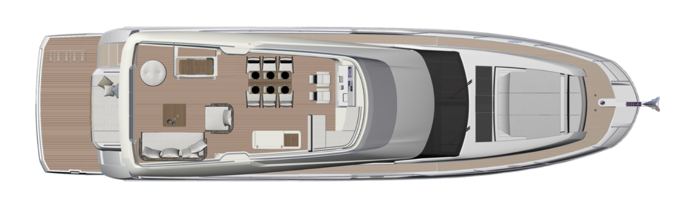 Prestige 690 stands out exceptional 22 sqm hardtop flybridge, complete with an electric sunroof for indulgent sun-soaked moments. Immerse yourself in seamless entertainment with the fully wireless Sonos sound system spanning across three zones: cockpit, saloon, and flybridge.