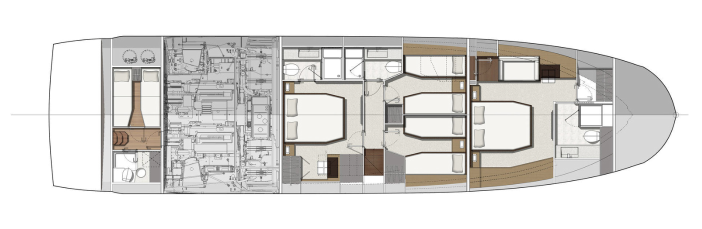 Crafted by the esteemed Garroni Design cabinet, Prestige 690 promises welcoming interiors and maximum comfort for its guests. The yacht boasts spacious and luminous areas, featuring four cabins that can graciously accommodate up to eight guests. From the galley aft to the panoramic views of the interior saloon, and the exclusive access to the master cabin, every detail exudes luxury.